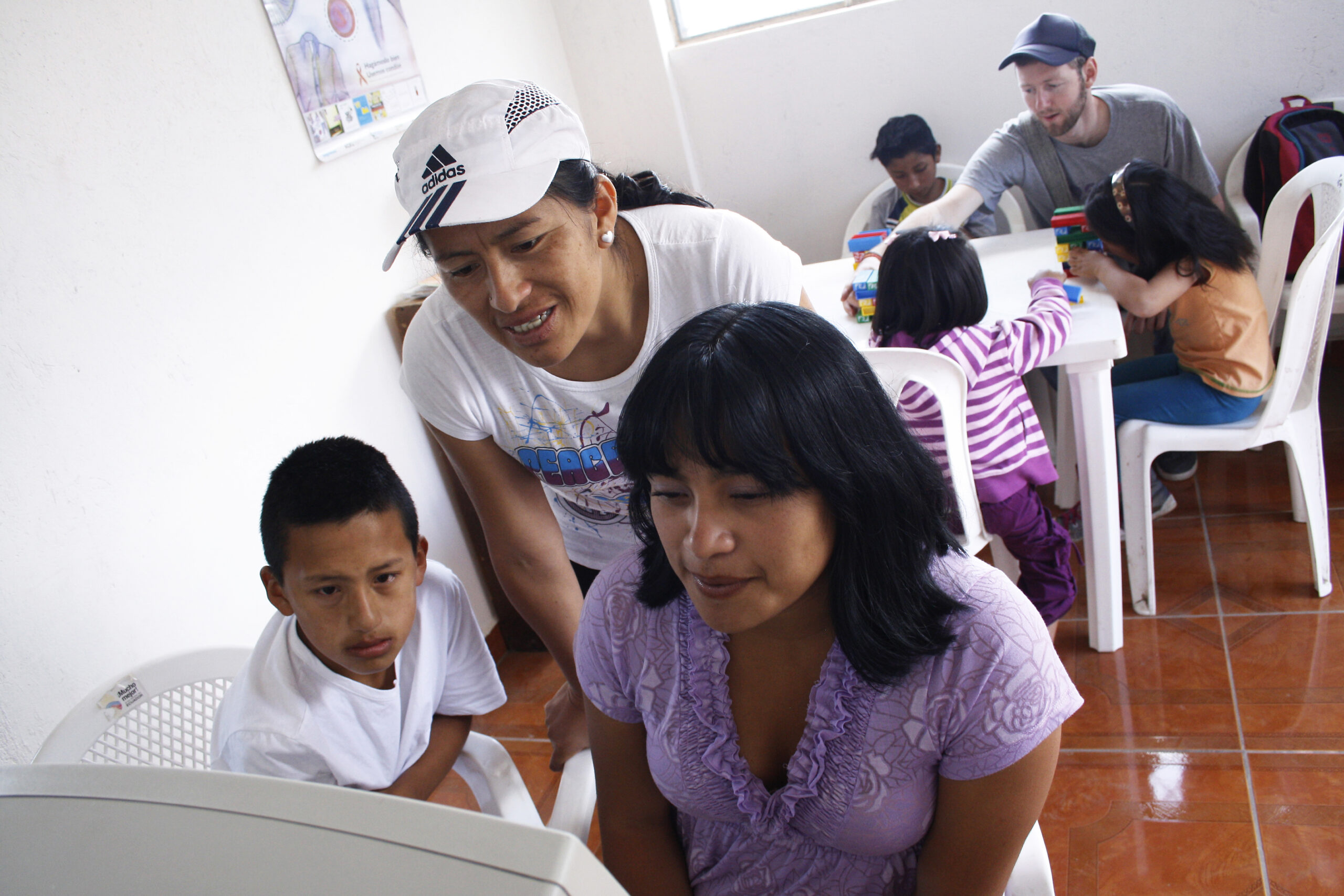 Alba Silva helps Saul Moina and Gabriela Silva with computer skills while Mission Network worker David Shenk plays with local Ecuadorian children of families from Iglesia Menonita Jardines del Inca.Photo by Juan Madera.