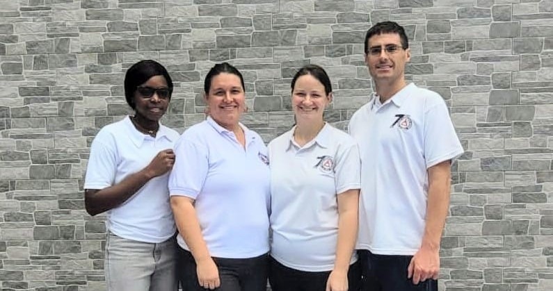 From left: Mennonite Central Committee volunteer Benedite Nerolel, Profe Ruth Daza, Laura and Nick Sharp pose in their teacher shirts commemorating the school’s 70th anniversary.