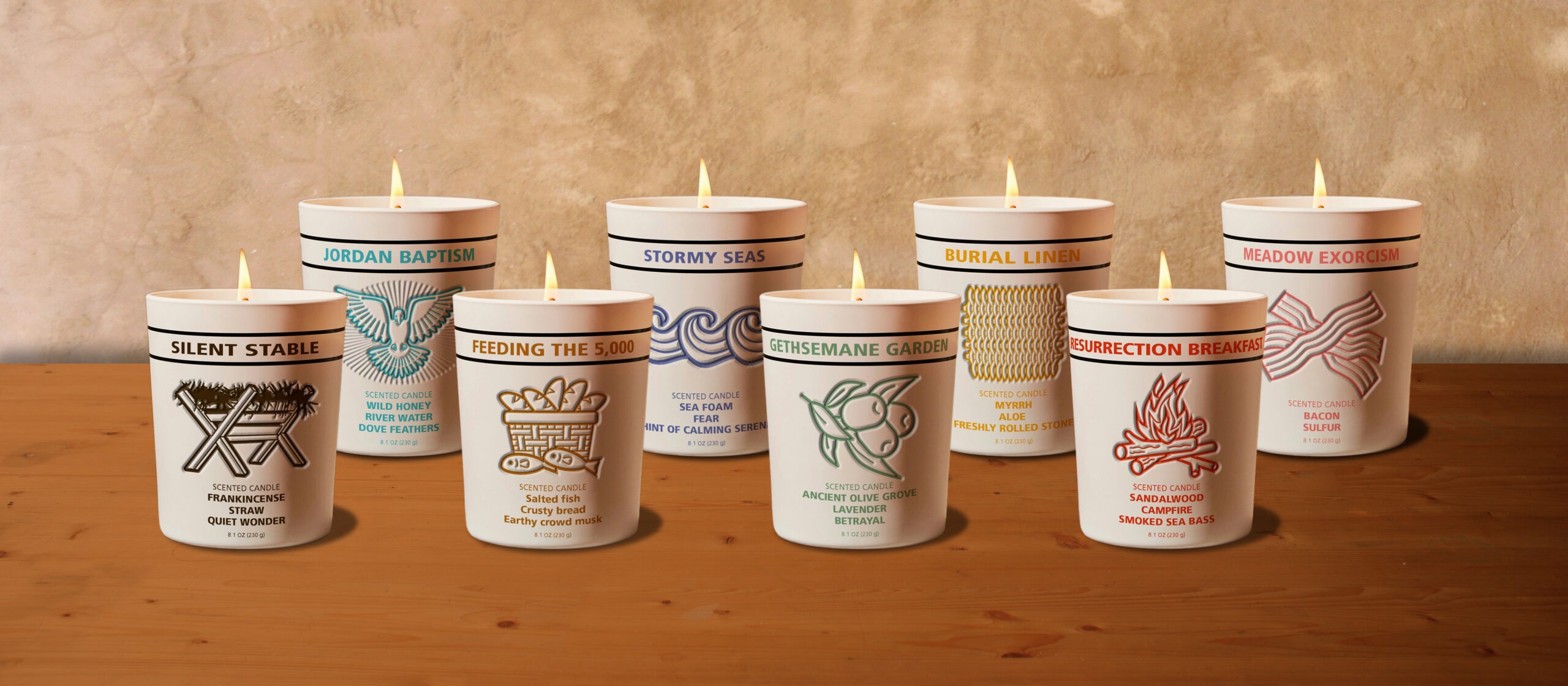 As you may suspect, the Savior Scents™ candle set is not a real product — though wouldn’t those Resurrection Breakfast and Silent Stable scents be amazing?