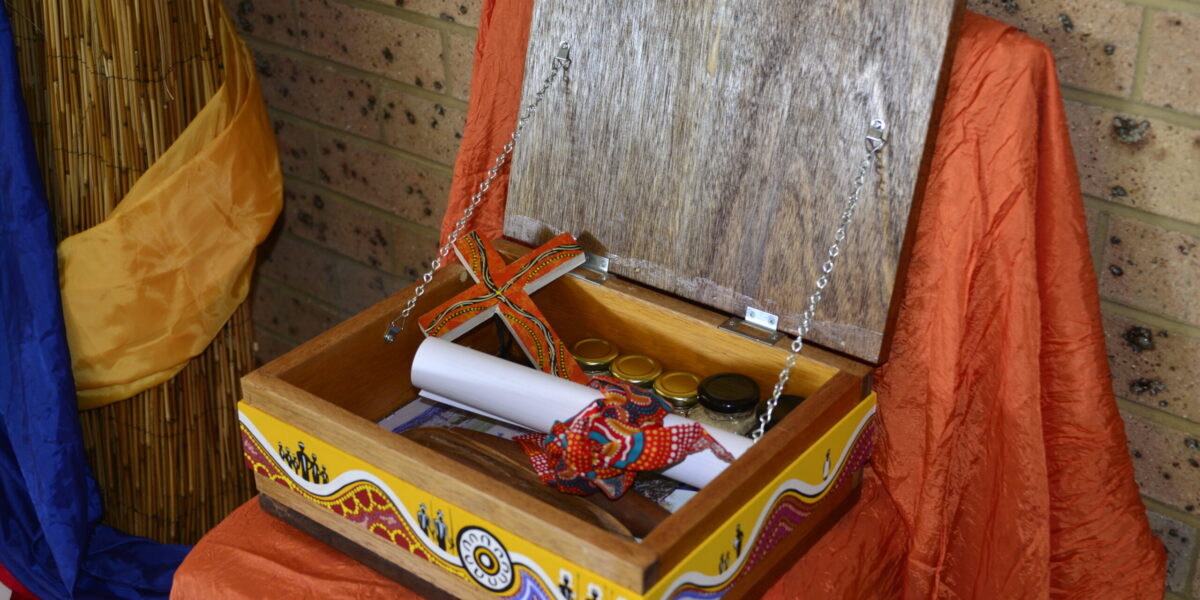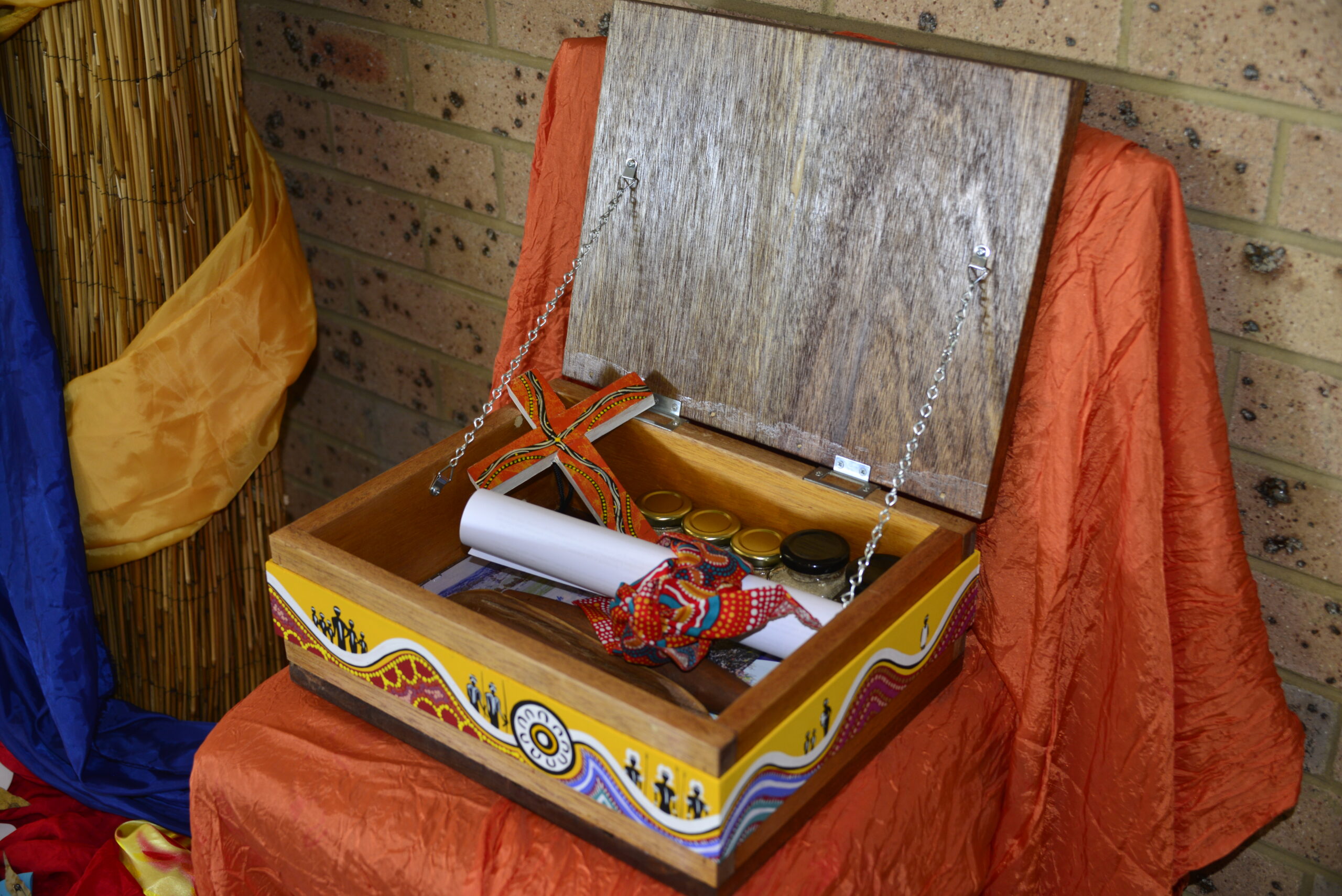 The treaty itself was signed by Aboriginal leaders and executive committee members of AAANZ. It was placed in a wooden box designed and painted by Aboriginal artist Safina Stewart, alongside other symbolic items, including sand from different regions of Australia, water, a painted cross, and Aboriginal clapsticks – an instrument traditionally used to accompany music.