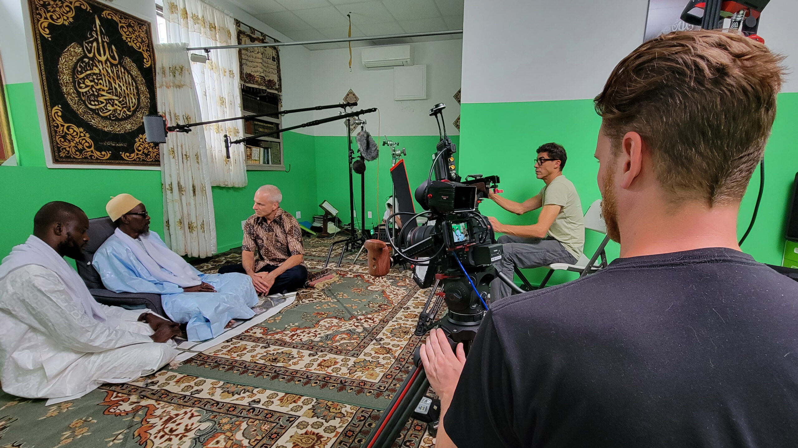 Naylul Maraam Islamic Center is a Quranic school in Harlem, founded and led by Ustaz Abdou Mbaye (far left). Jonathan Bornman is interviewing Serigne Afia Niang. Director of Photography Ehab Assal is seated at camera and crew member Josh Feezer is standing, on the second camera. Photo by D. Michael Hostetler.