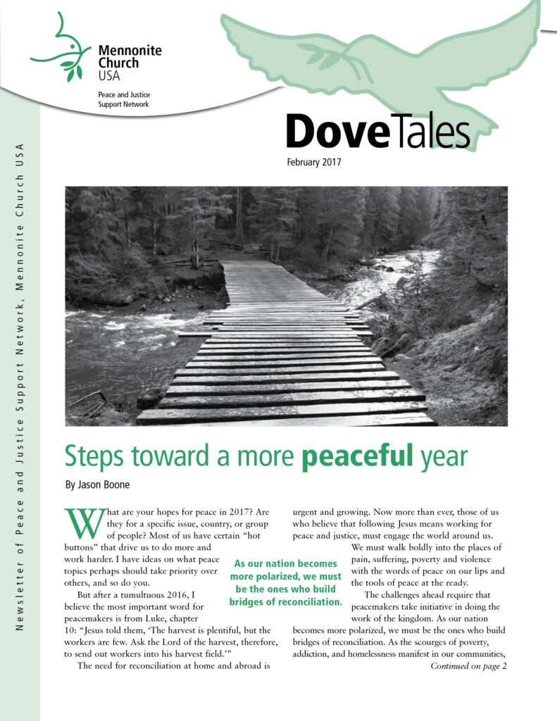 Jesus is at the center of this great work, and the church continues as a unique, irreplaceable vehicle for it. I’m committed in 2017 to the Peace and Justice Support Network providing tools for encouraging every church in Mennonite Church USA to embrace its calling as an active, engaged peace church.