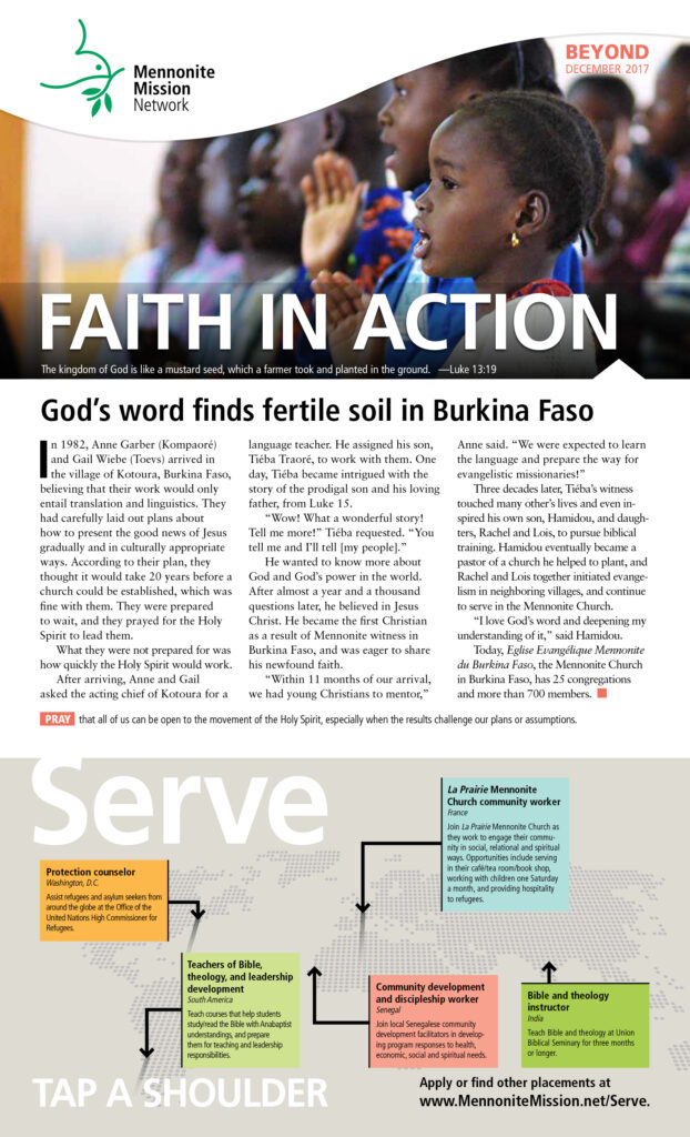 ​In 1982, Anne Garber (Kompaoré) and Gail Wiebe (Toevs) arrived in the village of Kotoura, Burkina Faso, believing that their work would only entail translation and linguistics. They had carefully laid out plans about how to present the good news of Jesus gradually and in culturally appropriate ways. According to their plan, they thought it would take 20 years before a church could be established, which was fine with them. They were prepared to wait, and they prayed for the Holy Spirit to lead them.