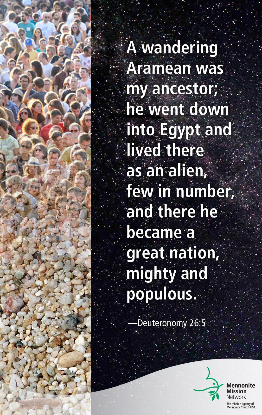 ​A wandering Aramean was my ancestor; he went down into Egypt and lived there as an alien, few in number, and there he became a great nation, mighty and populous.