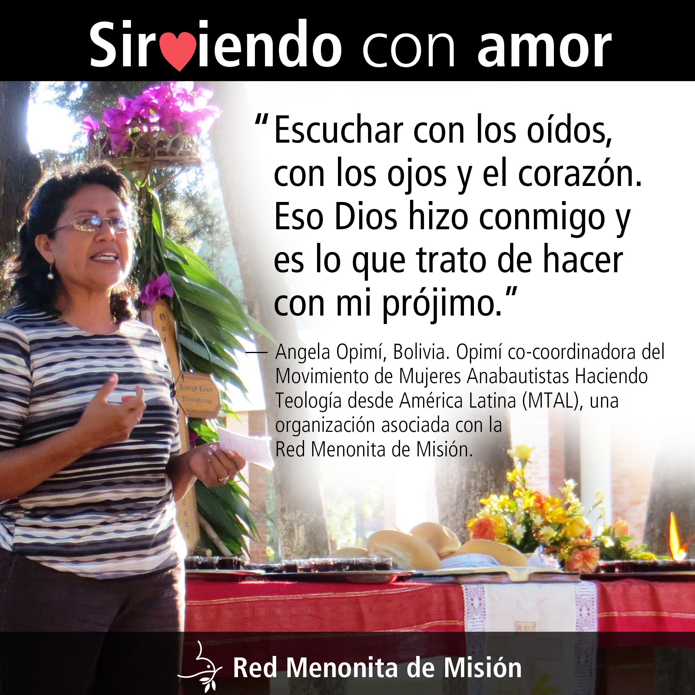 — Angela Opimí, Bolivia. Opimí co-coordinadora del Movimiento de Mujeres Anabautistas Haciendo Teología desde América Latina (MTAL), una organización asociada con la Red Menonita de Misión.