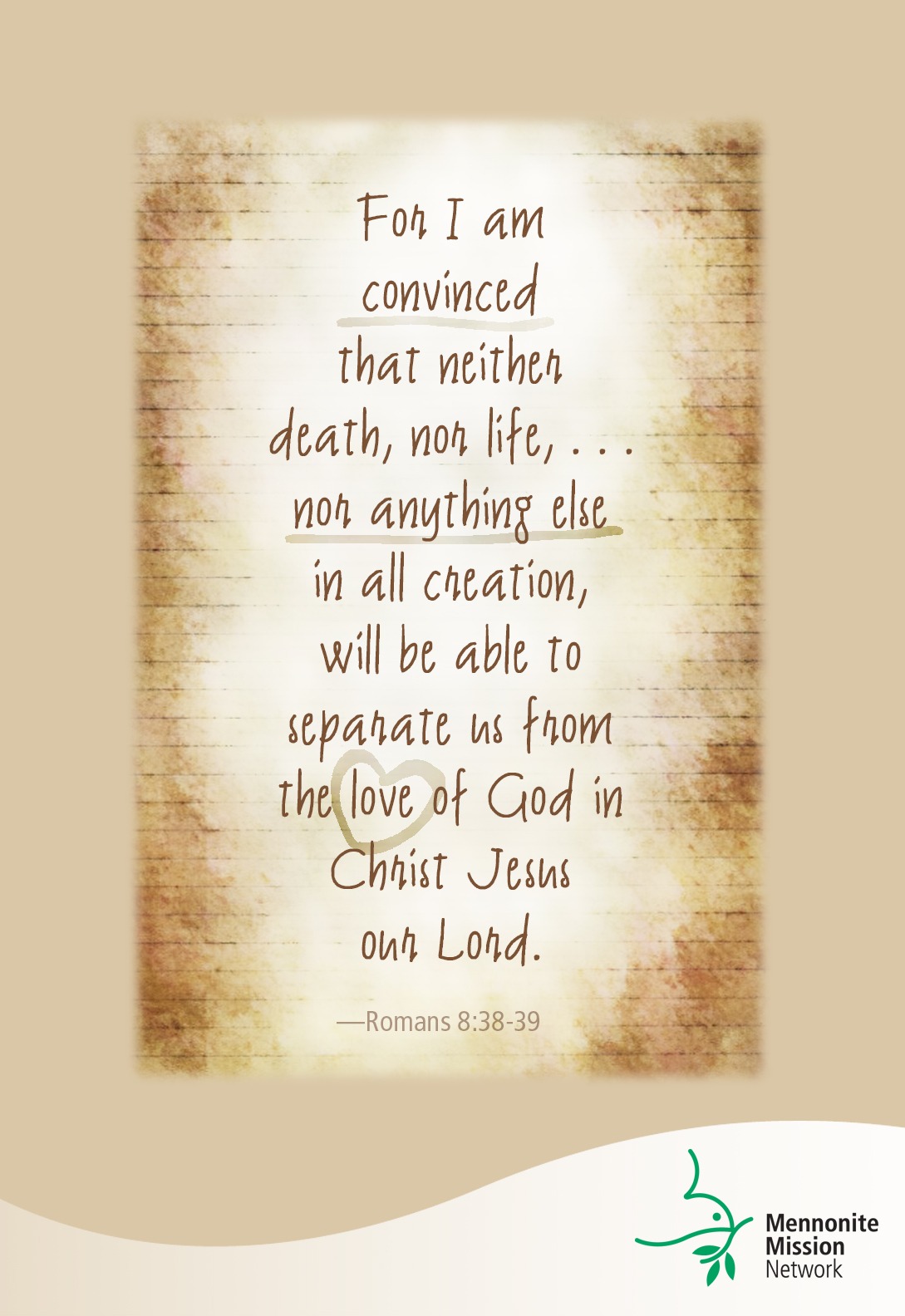 38 For I am convinced that neither death, nor life, nor angels, nor rulers, nor things present, nor things to come, nor powers, 39 nor height, nor depth, nor anything else in all creation, will be able to separate us from the love of God in Christ Jesus our Lord.