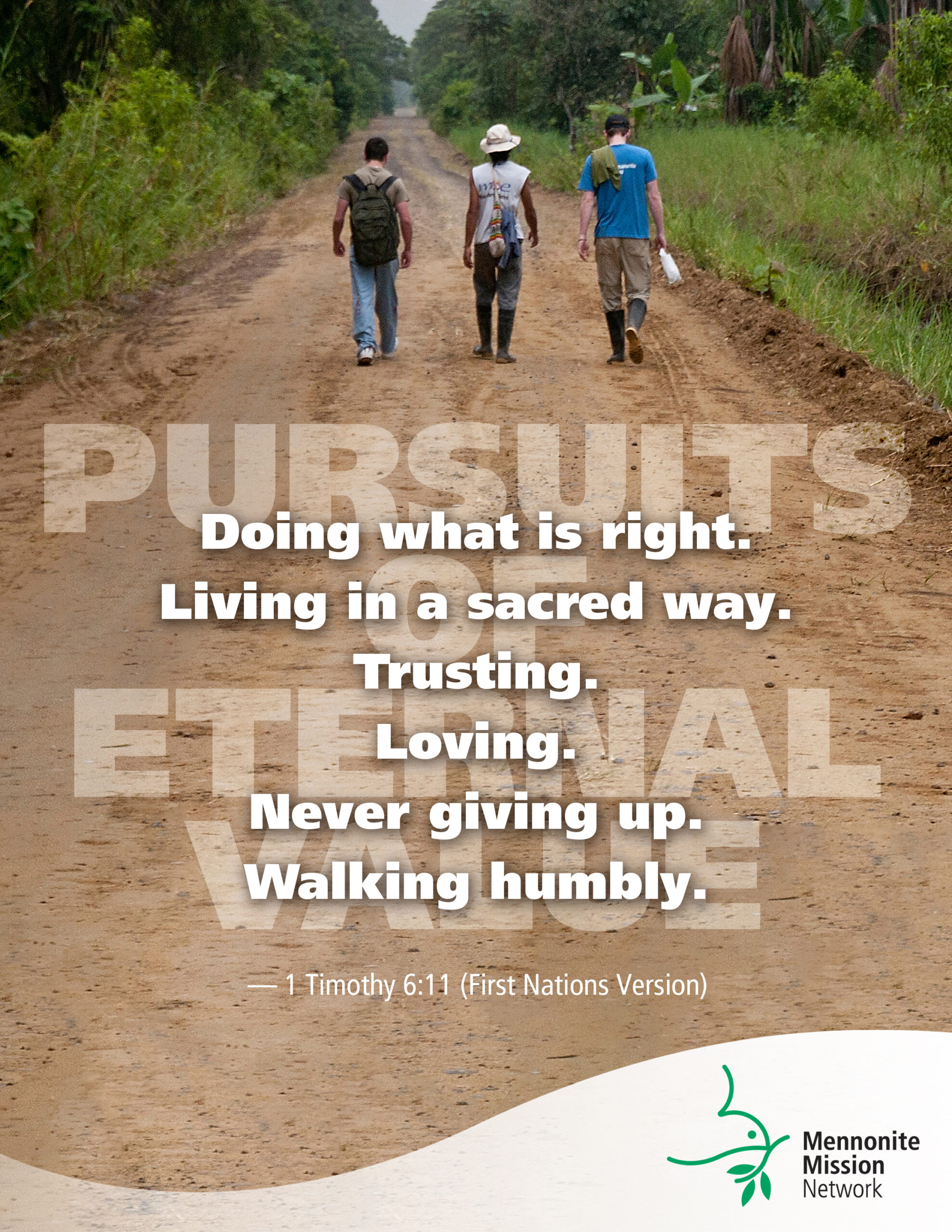 9 Those who long for more and more posessions stumble into temptation and are trapped by many foolish desires that drag them down and take them to a bad end. 10 For the love of possessions is the root of many evil, thorny branches. Some who have made posessions their aim in life, have walked away from the good road and have been pierced by thorns that bring them much pain and sorrow. 11 But you, o man who follows the Great Spirit, run away from these things and pursue doing what is right, living in a sacred way, trusting, loving, never giving up, and walking softly and in a humble manner. 12 Fight the good fight of trusting Creator. Get a firm hold on the life of the world to come that never fades away, full of beauty and harmony. The Great Spirit called you to this life when you said yest to him and made it known before many people that you had chosen to walk the good road with Creator Sets Free (Jesus) the Chosen One.
