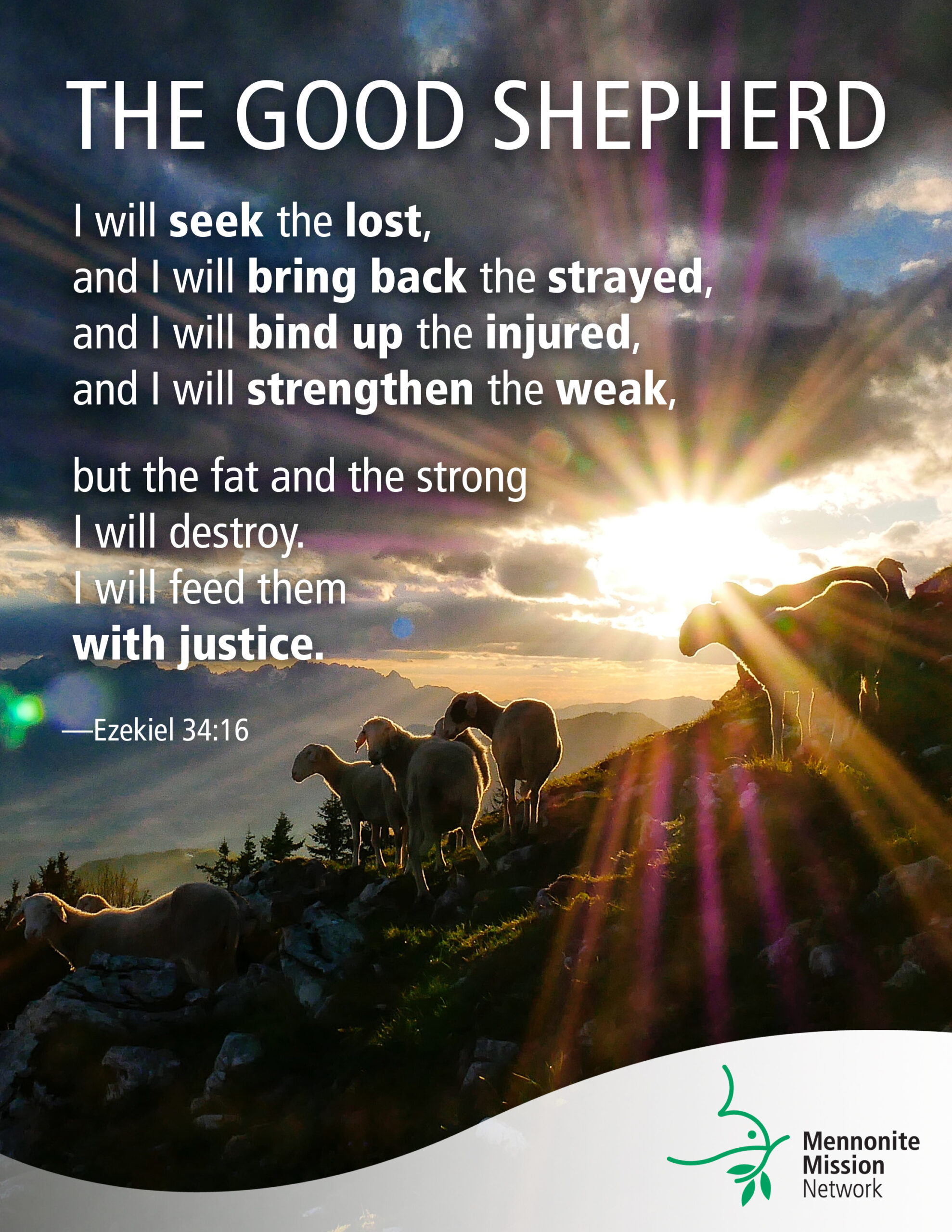 11 For thus says the Lord God: I myself will search for my sheep, and will seek them out. 12 As shepherds seek out their flocks when they are among their scattered sheep, so I will seek out my sheep. I will rescue them from all the places to which they have been scattered on a day of clouds and thick darkness. 13 I will bring them out from the peoples and gather them from the countries, and will bring them into their own land; and I will feed them on the mountains of Israel, by the watercourses, and in all the inhabited parts of the land. 14 I will feed them with good pasture, and the mountain heights of Israel shall be their pasture; there they shall lie down in good grazing land, and they shall feed on rich pasture on the mountains of Israel. 15 I myself will be the shepherd of my sheep, and I will make them lie down, says the Lord God. 16 I will seek the lost, and I will bring back the strayed, and I will bind up the injured, and I will strengthen the weak, but the fat and the strong I will destroy. I will feed them with justice.